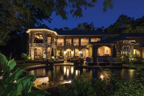 Five 9-watt "Volterra' LED WL1 well lights illuminate the front of this Missouri City, Texas home to accent the stone, stucco textures and the corbels under the eaves. All of the peaks on the house were softly accented with "Ravenna' brass LED MR16 bullet lights.