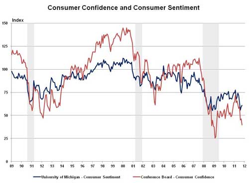 Consumer confidence remained at levels close to the darkest days of the Great Recession, but there was some disagreement among the two most frequently used measures about where confidence is rising or falling.