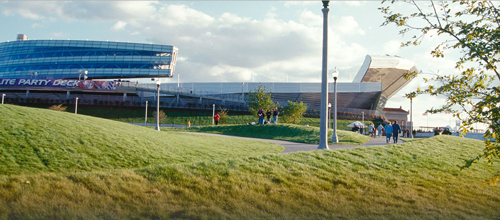 Peter Schaudt's design for Chicago's Soldier Field/North Burnham Park in 2003 placed the stadium's 2,500 parking spaces beneath a nine-acre green roof, and used sculpted landforms to surround the stadium with 17 acres of parkland. The green space includes a Children's Garden, a sledding hill and a view of the skyline. The project won the 2004 Green Roofs for Healthy Cities Awards of Excellence in the intensive industrial/commercial category. Image: Hoerr Schaudt Landscape Architects