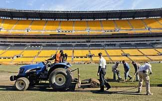 Grounds crews worked for more than 24 hours over the weekend to roll out 21/2 acres of fresh, green sod in time for the game. The new grass was placed on top of the old playing surface, known as DD GrassMaster, which is a combination of Kentucky bluegrasses reinforced with polypropylene fibers. Much of the green grass had been worn away and the field sported patches of brown dirt that became slippery and muddy in the rain. The ensuing game narrowly avoided becoming in the first scoreless NFL contest in 64 years. Luckily for all involved the game mercifully ended with a field goal with 17 seconds left. The final score: Steelers 3, Dolphins 0; Heinz Field, disaster. The original field was in such bad shape was because it was subjected to seven football games in 11 days, including four high school championship playoff games Friday and a University of Pittsburgh game Saturday. ?EUR??,,????'?????<????????We scalped down the grass we had, vacuumed and raked it?EUR??,,????'?????<???????? and put the new sod on top, said Chris Ecton, Heinz Field agronomist, at a news conference a day before the game. Under normal circumstances, they would have removed the original turf before installing the new grass. Time constraints did not allow that however. Installation of the new sod began after the Pitt game, and continued through Saturday night and Sunday morning. More than two dozen men and at least five fork lifts and tractors worked on the field, which was completed around 9 P.M. Sunday night. Rain Undermines Efforts The newly laid sod looked great ?EUR??,,????'?????<??????????????+ until it rained. The tarp that had been spread atop the turf leaked at five seams, and because the sod was positioned over the old field, there was very little drainage. In the hours before kickoff, grounds crew members had to resort to using pitch forks to puncture holes in the surface to drain the standing water. They feverishly tried to clear rainwater, but it kept coming. Armed with rakes, workers peeled up sections of sod and started dumping Diamond-Dry, a moisture-soaking mixture. To make matters worse, just after 8 p.m., officials cleared the field when lightning flashed, delaying the game about 15 minutes. As the players left the field, all of the freshly painted white lines were washed out?EUR??,,????'?????<??????????????+ the yard markers, the goal lines, end lines and sidelines. Workers started re-chalking those at 8:15 p.m. Once the game began, players slogged and slid in watery sprays, and punted balls landed like lawn darts, splashing down 4 inches deep into the soggy mess. Heinz Turf Rates Low The new sod was purchased from Tuckahoe Turf Farm, based in New Jersey with a facility in Pennsylvania. Representatives of the company said the turf would be fine for the game. The only cause for concern would be rain. In a 2006 survey conducted by the NFL Players Association, Heinz Field?EUR??,,????'?????<????????????EUR??,,??s field was voted the second-worst grass playing surface in the league. Voted ?EUR??,,????'?????<????????worst?EUR??,,????'?????<???????? was New England?EUR??,,????'?????<????????????EUR??,,??s Gillette Stadium. Since that survey, the Patriots have torn out the grass and installed FieldTurf. This game will most certainly prompt the Steelers, who are already investigating artificial surfaces, to look very seriously at installing one before the start of the 2008 season. They have been particularly interested in the new generation of FieldTurf called Duraspine that was installed this summer at West Virginia University. The team sent some of their people to WVU to take a look at the turf even before the debacle on Monday night. Sources: Pittsburgh Post Gazette, Espn.com