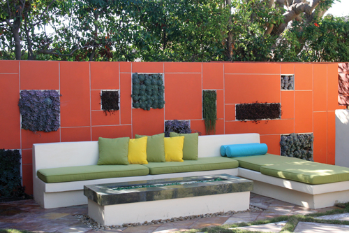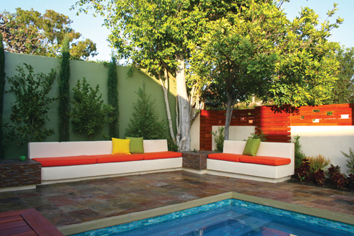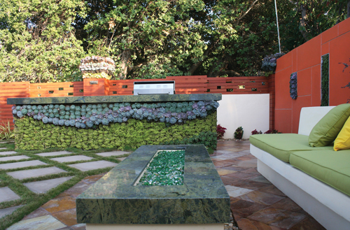 Backyard To begin, the homeowners decided to have their "L" shaped swimming pool, which was overtaking the back yard, turned into a lap pool. The depth of the pool was changed from eight feet to five and a spa was added at the east end. Because the depth of the pool was altered, a new surface was necessary. A light blue plaster was chosen and complemented with various blue colored glass tiles that line the inside perimeter of the pool. The slate paving on the pool surface and pool coping was preserved from the original landscaping. Next to the pool, a deck – made from Resysta, a composite recycled material, was created for entertaining purposes and extends the living room from the house. This area overlooks the pool, outdoor kitchen and seating areas to the left and right. The two seating areas are made from concrete structures that have a white plaster coating. The east-side seating area next to the outdoor kitchen is an "L" shape, 11.5 feet long with a seven-and-a-half foot long chaise. A two by six foot fire pit, also created from concrete and topped with green granite, sits in front of this seating area. The outdoor kitchen/bar area with BBQ, located in the same vicinity, is topped with the same green granite. The secondary seating area on the west side of the pool is 10 feet between the two side tables, faced with Resysta, one of which doubles as a beverage cooler, while the other seating structure is five-and-a-half feet long. Fencing & Walls When the project began, the fences in the backyard were pilasters with swooping walls and wood trellises. This was another of the many challenges of the project, as the team had to modernize this look and fill in the open spaces of the swooping walls. To offset costs the team decided to add Resysta planks between the open spaces of the swooping walls, which also matched the front yard gate design. On the east side of the yard a Mondrian patterned wall with inset plants, painted in burnt orange, was created from concrete. At the opposite end of the yard a green colored wall, also made from concrete, was added. Planting Design One of the designs of the backyard incorporated a grass grid pattern into poured-in-place concrete squares, which is irrigated with a drip line underneath. The most impressive plant design is the succulent living wall on the kitchen/bar structure, which has a soil base and is irrigated through a drip line. Chicks and hens line the top half of the structure, while string of pearls line the bottom half. Several other living wall structures are placed atop the fencing and inside pockets of the Mondrian wall. The inside pockets include echeveria, aeonium and string of pearls. Other plants throughout the backyard include Italian cypress, "Bearss' lime, "Oliver Twist Kohuhu', Mexican sage bush, Madagascar jasmine, "Brakelights' red yucca, dwarf pomegranate, coleus and mirror bush. Lighting Nearly 80 Volt lights were used throughout the project. Seven LED "Top Dog' cast brass spotlights were placed around the trees for uplighting, 47 Infiniti 20 LED spotlights were used throughout the plant beds, and Brass Bunker Hooded step lights on the walls. Project Challenges The budget was a huge challenge, as the project doubled in size from just the backyard to include the front as well. Studio H2O worked closely with the contractor and came up with some creative ideas when they could not compromise the materials chosen for the design. Design Team Landscape Architecture, Studio H2O Construction Team Pool Contractor, Morales Pools Landscape Contractor, Camillo Banuelos Vendors Wood paneling: Resysta Granite & glass tile: Bourget Bros. Building Materials Lighting: Volt Lighting Plants: Green Thumb Nursery