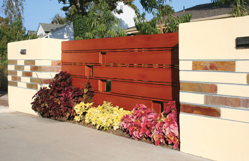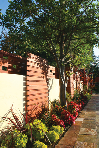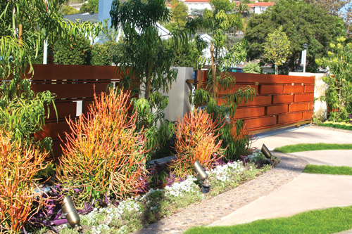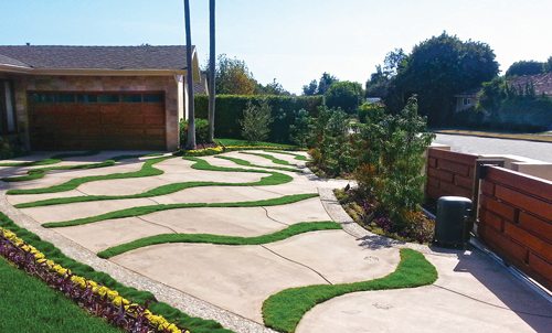 When the Longworth's decided to remodel their backyard landscape they were referred to Studio H2O, located in Santa Monica, Calif. The goal of the project was to update their traditional backyard, and to make it more "entertainment" friendly. However, the project quickly morphed into a complete landscape remodel, front and backyard, when the homeowners got a taste of what the team at Studio H2O could create. An initial challenge of the project was the different design tastes of the couple. In the end, the husband, a traditionalist, gave in to his wife's modernist ideas and began contributing to the design. The project, a total of 6,000 square feet, took approximately eight months to complete. Front Yard Although the front yard was not part of the original plan, it received a complete remodel, including a new driveway, planting design and custom gate. The driveway was an issue for the homeowners for a couple of reasons. First, because the turn in the driveway was off, the homeowners had a hard time getting cars out of the driveway without crashing into the pilasters or dropping off the curb at the sidewalk. Second, the concrete had cracked in many locations and had been replaced over the years, leaving a series of concrete patches that were not uniform. Another problem the homeowners had was vandalism to their landscape by kids from the local middle school. The new meandering driveway was created with expansion joints to prevent cracking, and a wavy pattern of grass was laid between the colored and leaf stamped concrete pieces. The grassy area of the driveway has a Grasspave2 structure so that cars can drive over without sinking into the grass. The driveway path was also corrected so the homeowners would not have a problem entering or exiting the driveway. Forty-two inch tall custom gates, added to help keep away neighborhood kids from vandalizing the landscape, are made from white cement walls and stained wood. The design of the movable wood fencing has open slats to create a friendly look, and the white cement walls have a coordinating Resysta facing. Most of the plants in the front yard were replaced, leaving only a few existing shrubs, rose bushes, a big maple tree and two king palms as part of the new plant design. The outside of the driveway is lined with purple heart and Korean grass. Two plant beds facing the street have golden dome hebes, Henkel's yellowwood and Mexican sage bush. The lawn is cutting edge grass with coastal rosemary, dwarf-winged burning bush, firestick and Henkel's yellowwood disbursed throughout the yard. Lastly, a Swan Hill olive tree was added at the right side of the driveway.