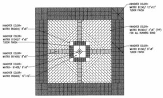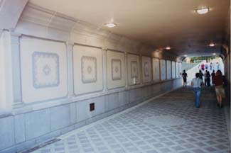 This pattern is reminiscent of the historic paving patterns of rotated squares, alternated with circles, within a field of diagonally laid paving. To create the "base-middle-top" rhythm on the walls of the tunnel, which is the typical theme in Beaux Arts style architecture, several modern materials were selected. The wainscoting, including the base, panels and chair rail, were custom designed and manufactured pre-cast concrete panels by Hanover. They have a smooth honed finish. I spent a lot of time reviewing samples to arrive at the final aggregate and concrete matrix and finish that most closely matched the granite base found on Wilson Hall. The pilasters and cornice are custom made cast stone (to mimic limestone found on Wilson Hall and the Guggenheim Library), and cast by Artistic Architecture Company.