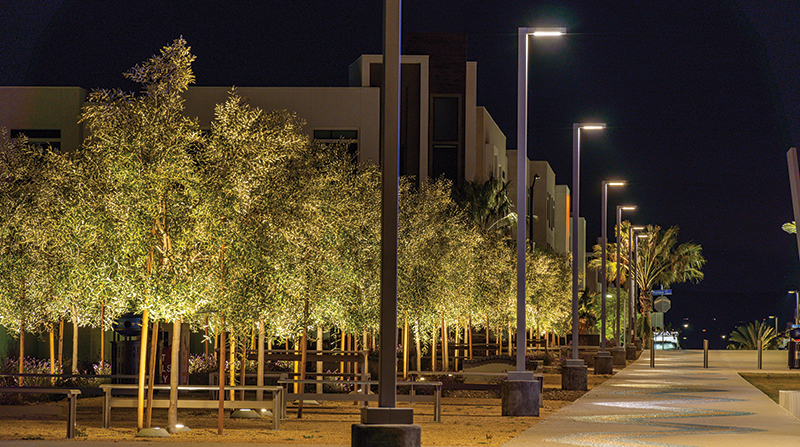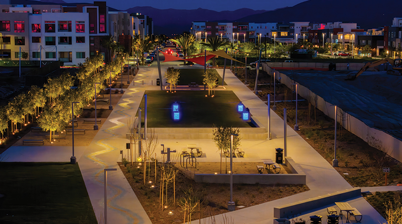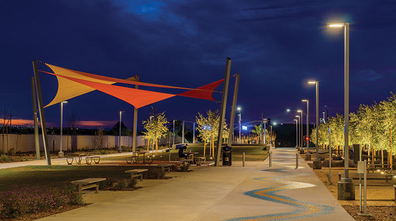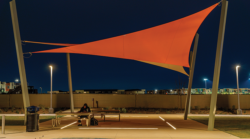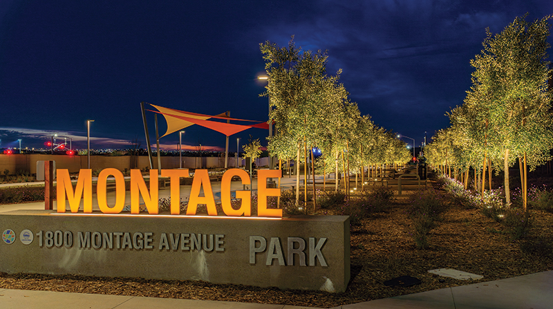 Montage Park stands as a beautiful centerpiece within the Millenia master-planned community of Otay Ranch in Chula Vista, California, which is about 10 miles south of San Diego. Covering 1.62 acres, this civic park is the sixth in a series aimed at fostering a balance between natural beauty and recreational areas to enrich the social fabric of the community. San Diego-based firm Spurlock Landscape Architects was retained to help the city bring the park to fruition. The FundamentalsThe park design was initiated through a master planning process involving several workshops with the community and the Chula Vista's Park and Recreation Commission. The city reviewed the design plans, issued permits, and conducted inspections during construction. Meridian Development, the developer of the surrounding Millenia community, was responsible for overseeing the construction and implementation of the park that was then turned over to be managed by the city. Lighting it UpIn collaboration with the Landscape Architects, San Diego-based lighting design firm Visual Concepts Lighting (VCL) was entrusted with the creation and execution of the lighting concept for the site. Their role included crafting a distinctive lighting theme that complements the landscape architectural vision and enhances the overall aesthetic. From the initial conceptualization, cutting-edge design principles were integrated to create a unique visual experience, tailoring the lighting elements to suit the specific needs of the environment.VCL also handled the technical aspects of the project, including the development of detailed electrical plans and all associated installation documentation, such as precise installation details, notes, legends, and schedules. The team ensured that every aspect of the lighting installation was meticulously planned to allow for a seamless implementation of the lighting design and to guarantee that the lighting system was installed to the highest standards, both technically and aesthetically.A Magical Transformation from Day to NightWhen the sun is out, Montage Park invites visitors to explore its expansive vistas and well-maintained areas. As night falls, the park reveals a captivating allure that amplifies the community's vibrancy. The lighting design was intended to create a cohesive visual narrative that heightens the park's natural beauty and creates a safe environment for evening activities. Upon entering the park at night, visitors are welcomed by an illuminated monument sign that highlights the park's name, setting a warm and inviting tone. This thoughtful illumination serves not only a practical purpose but also sets the stage for the enchanting experience that awaits within the park.