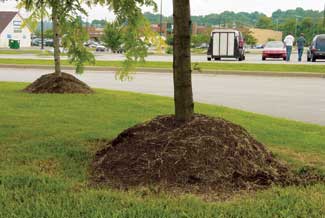 A common practice in many landscapes is volcano mulching ?EUR??,,????'??? the placing of mulch in a cone around and next to the trunk 8 to 12 inches high and extending horizontally about 2 feet in diameter. This depth of mulch restricts oxygen exchange with the roots, but also creates a moist environment at an elevated position near the base of the stem. This moist environment promotes cracking of the bark, creating an entry point for insects and fungal growth as well as conditions favorable for rodents to chew the bark and damage or girdle the tree.