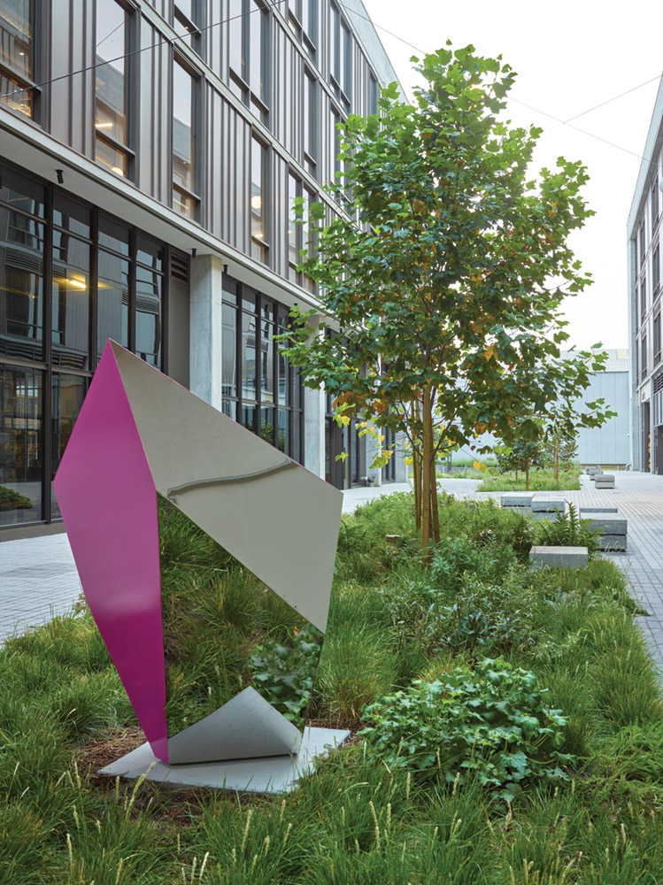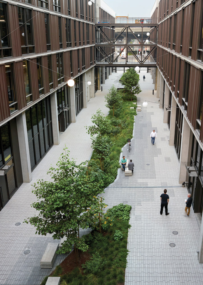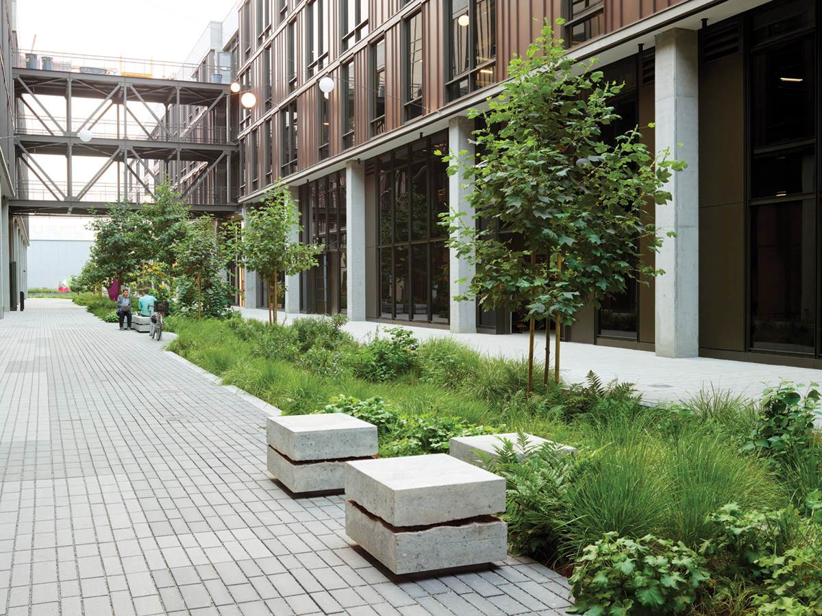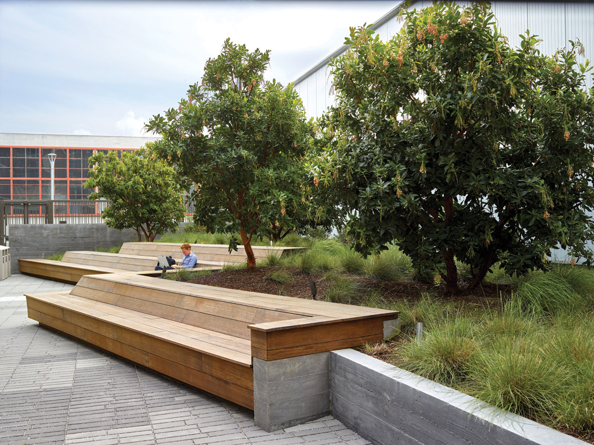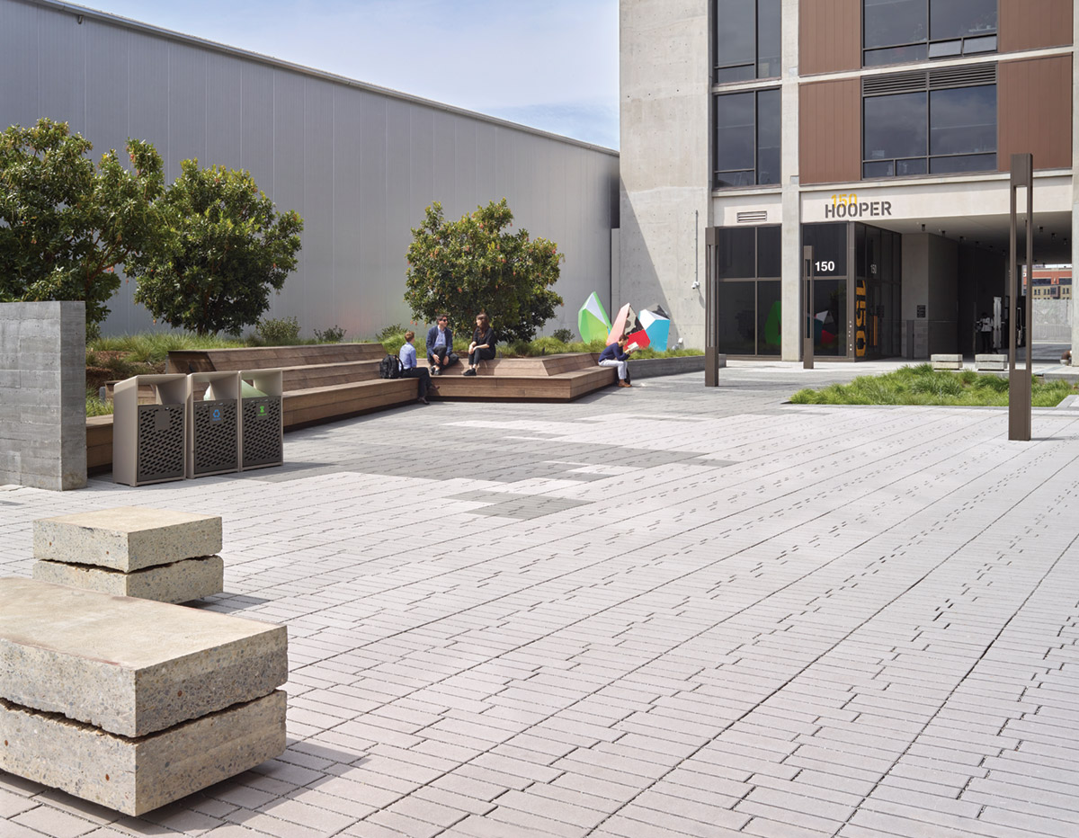 Located in San Francisco's Design District and adjacent to California College of the Arts, 100-150 Hooper Street was formerly a large parking lot. It is now a 400,000-square-foot multi-use facility known as Hooper Campus. Surfacedesign was hired by developer Kilroy Realty to create a multi-functional courtyard between the development's four-story buildings. Planning The site sits on former baylands and is located directly on the outflow to Mission Creek, a feeder to Mission Bay. This requires the Hooper Campus landscape to be both functional and performative. In addition to managing stormwater, the courtyard serves as a service corridor for large trucks to deliver to makers' workshops. Surfacedesign's plan combined the functional compulsories with aesthetics inspired by modern industrial innovation to complement the site's building architecture.