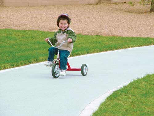 A variety of pathway surfaces, including concrete and crusher fines and play areas of turf and rubber tile, help children learn to walk and use canes on different surfaces with varying textures. Sidewalk intersections are marked with exposed aggregate concrete to help guide navigation.