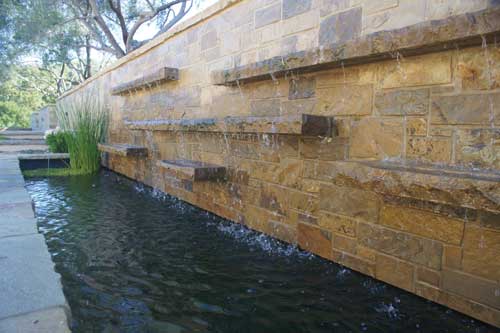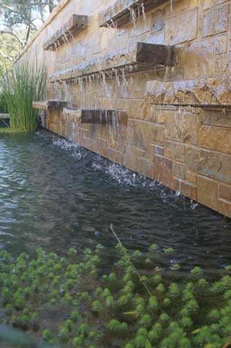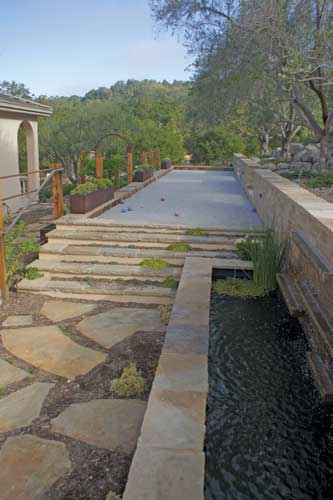 The linear retaining walls are veneered in Dakota stone, fabricated by Wheeler Zamaroni of Santa Rosa, Calif. The walls transition from a ledged water feature spilling into a lily pond on the patio level, to a border for the bocce court, which is six steps up from the patio. Channels are cut in the underside of the ledges of the water wall to accommodate LEDs.