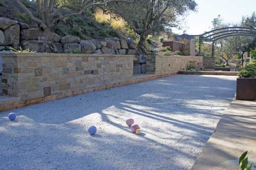 The bocce court has a mix of oyster shells and decomposed granite. A French drain is concealed along the edges of the court. Breaks in the bocce court wall allow for additional seating. Thirty-year old Manzanillo olive trees (from Vecchio) were craned into place on the slope above the court. The spaces between the flagstones and the steps are planted with thyme and other herbs. Steel planters by sculptor Mark Staz line the bocce court.
