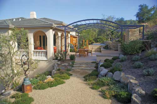 This extensive garden renovation was fueled by the owner's desire for a more user-friendly space in a confined backyard area. The home is in Healdsburg, Calif. (pop. 11,254), 70 miles north northwest of San Francisco in Sonoma County. The home, built by a developer, was cut into the native hillside, leaving a very narrow yard four steps down from the house, with two sets of four-foot high retaining walls. Now, a continuous stem wall along the backside of the house allowed the opportunity to bridge straight out from the existing covered patio. An extensive CMU block retaining wall that aligns with the house creates a series of spaces.