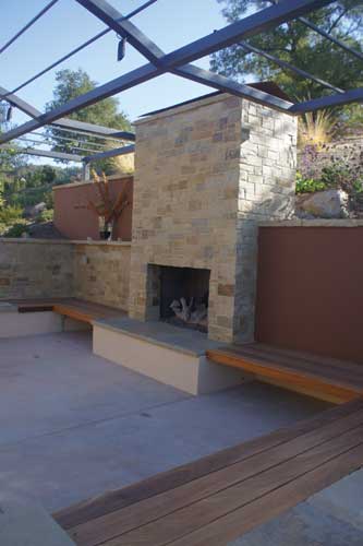 A fireplace anchors the tallest wall and provides a focal point in the main living area. Built-in benches help scale its eight-foot height into a comfortable room. A steel pergola/trellis covers the space and accommodates speakers, heaters and lighting for dinning and salsa dancing. A light acid finish for the concrete patio makes for a smoother surface to facilitate fancy footwork. The peogola will eventually have a cover of wisteria to offer shade for the patio and bocce court. A raised lily pool and water wall provides additional seating in the space between, a nice focal point when seen from within and a subtle way to convert the retaining wall into a functional design feature. The quiet dripping from the long slender stone pieces is amplified by the acoustics of the tight space, providing serenity to the space.