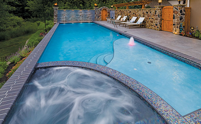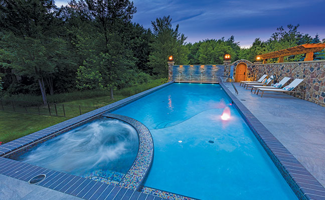 When Patrick Cloonan, of Cloonan Design Services Inc., was selected to work on a custom residential project in Orange Village, Ohio, the owner's primary goal was to add a pool in their backyard just outside their walkout basement. The pool was the client's dream, not only because of the statement it would bring to their home, but it was needed for their handicapped son's therapy. After months of designing and workshopping a concept with the homeowner, Cloonan and his clients finally landed on a plan for their dream backyard. With the design set, the Landscape Architect went before the city to submit the project for permitting. During the meeting, the city informed the Landscape Architect that the area at the rear of the client's home is on a restricted wetland, and they would not be able to proceed with the project. The homeowners were in tears when they heard the news. At the time, there seemed to be no space anywhere else on the property to put in the pool that they desperately needed. "I told her I would make it work," Cloonan explained as he went right back to the drawing board. The Landscape Architect immediately began creating concepts that gave the client their dream pool that utilized the tight space near the garage. Fortunately for Cloonan and his clients, there was a long, narrow, sloping lawn area behind the garage and a parking bay to help back out of the garage. "When I first showed the client my drawings, they thought there was no way to make it work, and they thought it would be too small," Cloonan resolved. Despite their doubts, they trusted Cloonan, and the building plan was approved. The pool is 16 feet by 50 feet and is nestled between a massive retaining wall and a quaint patio on the other side of the garage and parking bay.