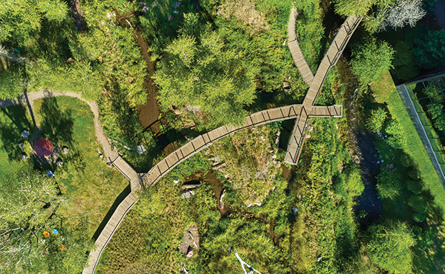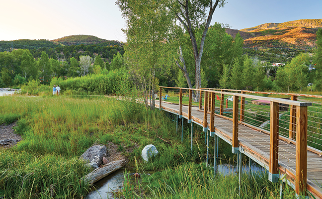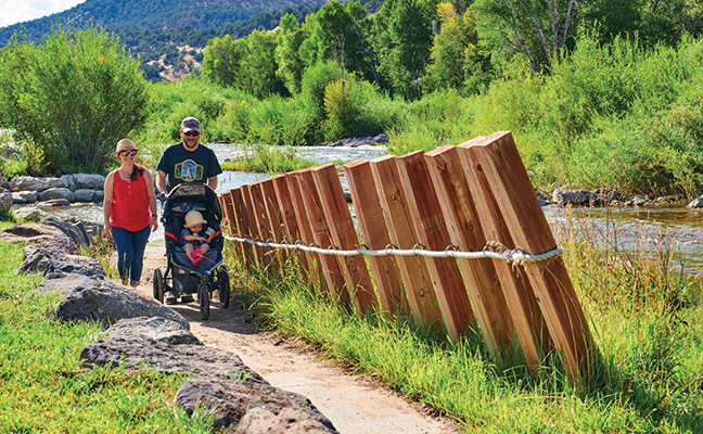 Basalt, Colorado, located in the Rocky Mountains, has a rich history dating back to the mining era. Initially a Ute Indian Reservation and hunting ground, demand for charcoal to power mining operations smelters in Aspen, and the availability of Pinion trees for fuel, resulted in the construction of seven kilns in Basalt in 1882. Originally, coal was transported to Aspen by mules and horses, but in 1887 the area saw the introduction of the Colorado Midland railroad. All this industry attracted workers and a 'man camp' sprang up on land that is now home to two parks straddling the Roaring Fork River. Basalt's relationship with the two rivers, at its core, has ebbed and flowed over time like the rivers themselves. In 2000, a new partner of Connect One Design employed at a previous firm, worked with the Town of Basalt to produce the Basalt River Corridor Implementation Plan to create recommendations for the land use code that enabled the community's vision for development along Basalt's River corridors to come to life. The plan was then used to update portions of Basalt zoning to more appropriately address properties adjacent to the river. In 2011, though modern Basalt's identity and economic vitality are directly tied to the recreational opportunities offered by the two rivers that converge at its center, significant sections of river frontage remained unknown, inaccessible, and underutilized. The downtown stretch of the Roaring Fork River was flanked by a mobile home park on one side and a historic ranch dumpsite now overgrown and trashed by local transients on the other. Concrete blocks and random boulders shored up both sides of the eroding riverbank, creating health and safety concerns for the community. Recognizing the value of the riverfront property identified in the Implementation Plan, the Town of Basalt, in conjunction with a group of concerned citizens, purchased the two parcels located directly across from one another in the river's 100-year floodway. Thus, Midland Park, with the aid of local landscape architecture firm, Connect One Design, became one of the first projects to connect the town visibly and physically to the Roaring Fork River in an ecologically sensitive manner.