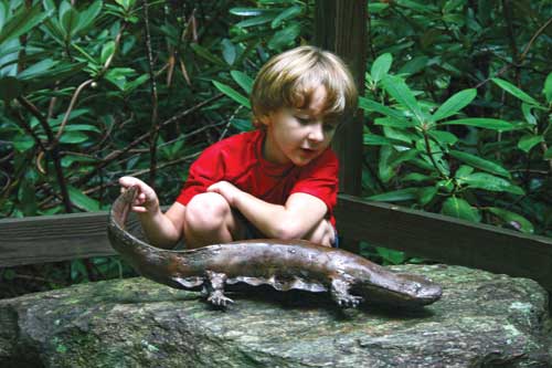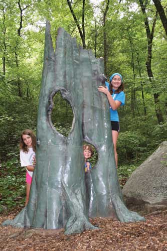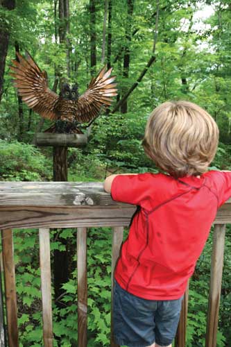 A copper Great Horned Owl (Art of Nature Coppersmiths) perched high atop a post clutching a snake in its talons can be spotted from the tree house, a popular spot along the trail. The life-sized sculpture of a native Hellbender salamander (Garden Art) also sparks curiosity and wonder.
