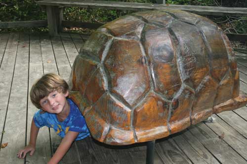 A close examination of this larger than life American Toad will reveal nuts, bolts and scrap metal placed by sculptor Grace Cathey, who uses recycled materials from her husband's auto body shop to create masterpieces. The box turtle shell is carved from a solid piece of wood and is raised above the deck to allow children to climb inside and see the world from a more reptilian perspective.