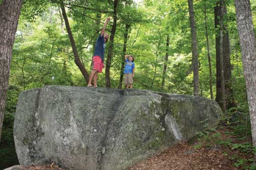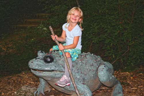 Continuing on the shady trail leads to the resident toad, which always offers a ride to the kids. Grady's other friends along the trail include butterflies, moths, chipmunks and the raccoon's favorite tree. As the trail winds down to the end, a massive boulder appears, a favorite picnicking spot, complete with replicated ancient petroglyphs of animals that once roamed the area.