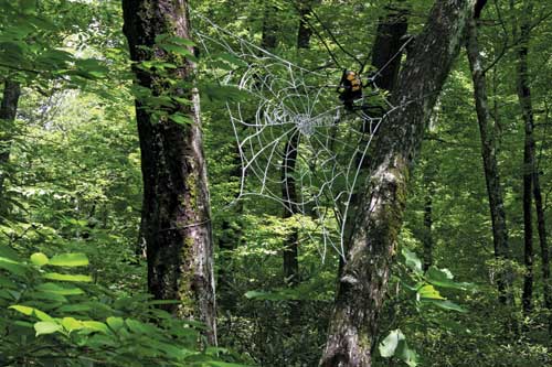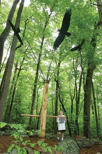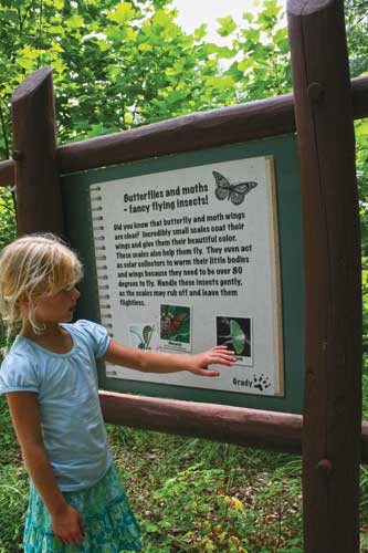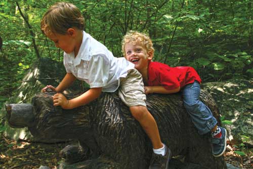 Further down, salamanders are strategically hidden among the brush, and a giant spider lurks in a web high in the trees. At another station kids learn about birds of prey and, with a simple push, send the birds into flight circling above their heads. Halfway through the trail, visitors encounter a mother bear and her cubs, created by local artist and wood carver Jeremy Buckner. Mother bear just may let visitors sit on her back as she watches her youngsters climb the tree trunks.