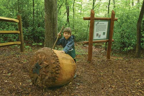 Trail Travel Twelve interpretive stations are nestled in the hillside throughout the trail, and a guide, Grady the Groundhog, leads visitors through educational stops about local creatures, their habitats and what nature looks like through the animals' eyes. Kids can pick up a brochure that helps them identify the footprints of different animals they may see along the trail, and Grady encourages children to bring a notebook and record experiences along the journey. Other brochures offer a hide and seek quest, in which the kids help Grady locate many things that may be hiding along the trail. Meander along the easy ???(R)???AE????-mile loop and you'll soon feel like you're the size of a squirrel during an encounter with giant, 300-pound acorns carved from oak.