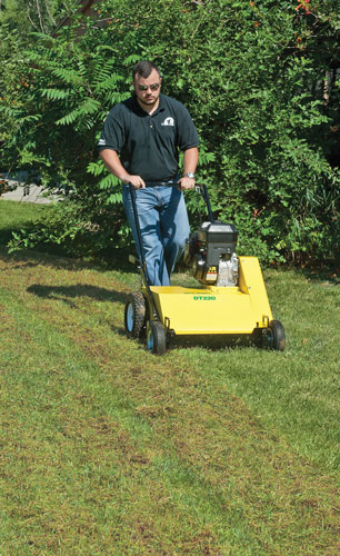 The flail blade assembly has 11 blade height settings to remove thatch without disturbing root structure in virtually any turf. No tools are needed to make height adjustments. Turn the DT220 into a combination one-pass seeder with the addition of SourceOne's DT020 Seeder Kit or convert to a slicer with the DT010 Slicer Kit. For more information go to www.sourceoneope.com