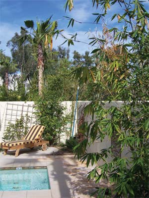“On the west side of the property there is heavy drainage from the adjoining upslope property,” explains Ric Crisp. “It’s an inherited problem,” he adds. The city is attempting to resolve the issue, but meanwhile water is invading the spa’s row of citrus trees, whose fruit is now drooping, a result of the inadvertent overwatering.