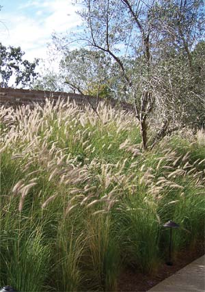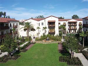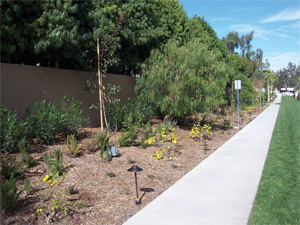 The mature eucalypti, of course, are long existing trees on the property, still, 165 15-gallon eucalyptus sp. were planted. Other trees include 52 California peppers; 47 Hollywood junipers; 43 Torrey pines; 39 candelabras (Euphorbia continifolia); 31 Valencia dwarf orange; 27 Italian cypress; 23 dwarf lemon; 21 dragons (Dracaena draco); a variety of palms (97 Mexican fan, 37 sago); olive; sycamore (at the entry, though at this time of year they are bare); aloe bainsii; Chinese elm and magnolias. Four marina strawberry trees were specified for the courtyard but wilted from the heavy rains.