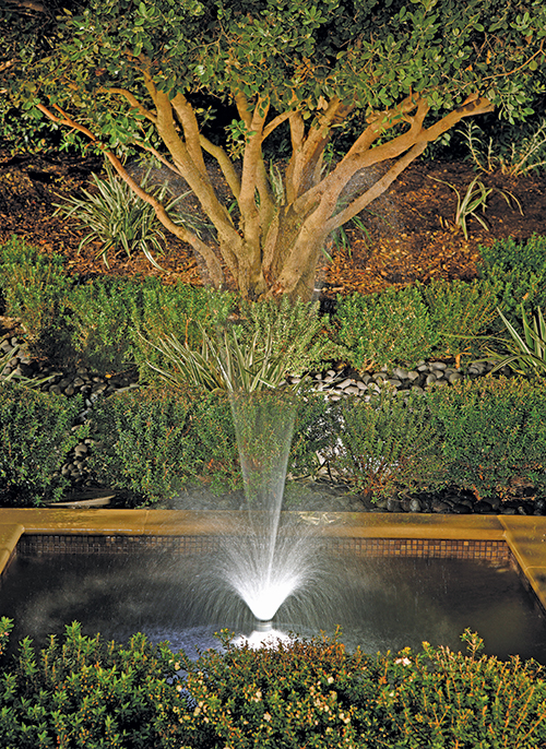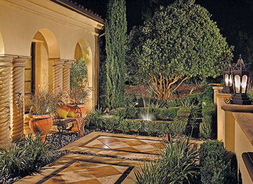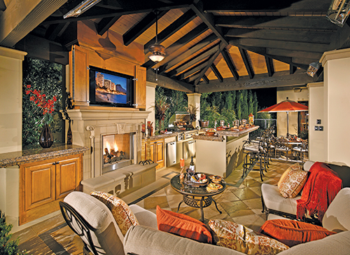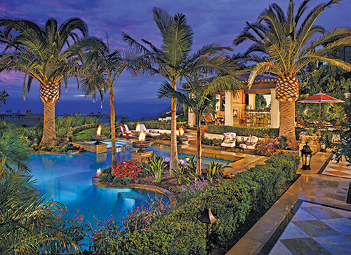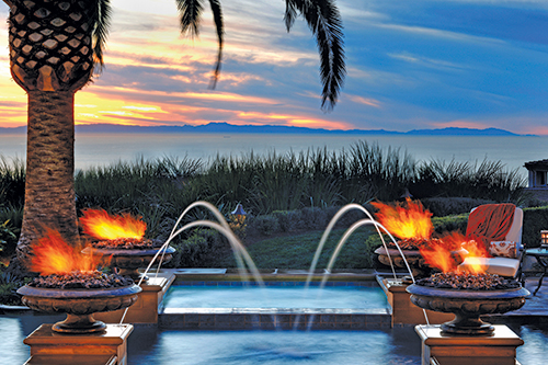 Hardscape & Site Amenities The contractor used more than 2,000 square feet of 18x18-inch travertine for the hardscaped area, complemented by 1,500 square feet of cinnamon quartzite stone and 400 cubic yards of concrete. A host of tropical and regional plant material accents the hardscaping, including Phoenix Canariesis, Quercus Agrifolia, 24-inch citrus trees, Birds of Paradise, Myrtus Compacta, Agave, Echiveria, Dianella Variegated and a variety of ornamental grasses. All the plant material is fed by Rainbird sprinklers. The outdoor kitchen area was populated with Lynx BBQ Equipment. The job used precast Pacific Stone Precast concrete products around the entire project. According to the contractor, scheduling was a major challenge. "The homeowners lived in Texas and we had to make all of our decisions during their monthly trips to California. Also, access to the rear yard was limited. Rear yard elements had to be installed in stages before the access was lost."