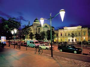 In celebration of its 450th birthday and in commemoration of its being showcased as a European Cultural Capital, the civic planners for Helsinki embarked on an ambitious lighting extravaganza that would highlight the history and architecture of the city. Identification of special architectural facades, sculpture and historic traffic corridors was tantamount with the creation of a comfortable pedestrian atmosphere through ambient light created by specialty and custom designed lanterns and luminaires.