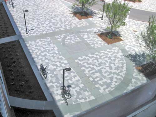 The plaza paving pattern into the main entrance of SAS Hall combines lighter to darker gray squares and rectangular patterns based on the ?EUR??,,????'??Golden Section,?EUR??,,????'?? i.e., applying the ratio of phi to the geometry of a space. The 5-ft sq. tree wells have 2-inch brick curbed edge constraints and planted with ?EUR??,,????'??Trident?EUR??,,????'??? maples.