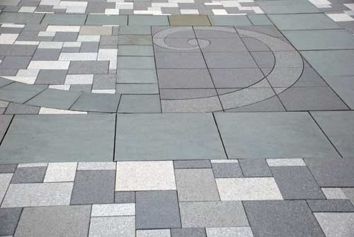The paving pattern comprises a combination of lighter to darker gray square and rectangular patterns based on the Golden Section proportions. The Golden Section bands are highlighted in larger dark gray bluestone pavers. The proportional hardscape panels for the plaza are visually evident. The pavers are a combination of ?EUR??,,????'??Eagle Bay Crimson Range?EUR??,,????'???, ?EUR??,,????'??Pine Hall Old Tavern?EUR??,,????'???, Wausau ?EUR??,,????'??Random Ashler?EUR??,,????'??? and ?EUR??,,????'??Bluestone.?EUR??,,????'???