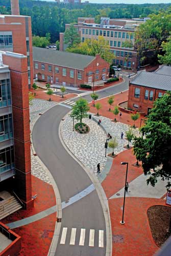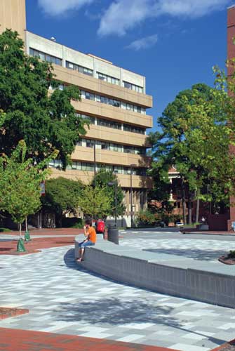 HadenStanziale then proposed four-foot wide curving bands crossing Stinson Drive, connecting the Park Shops Building side with the SAS Hall. The curving band on the Park Shops side becomes a seat wall. Surrounding the curvilinear band is brick paving used throughout the campus to contrast with the center plaza?EUR??,,????'???s precast concrete pavers. This concept proved successful in tying together the two flanking plazas and allowing the strong S curve of Stinson Drive to pass through the space safely.