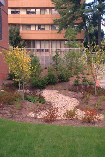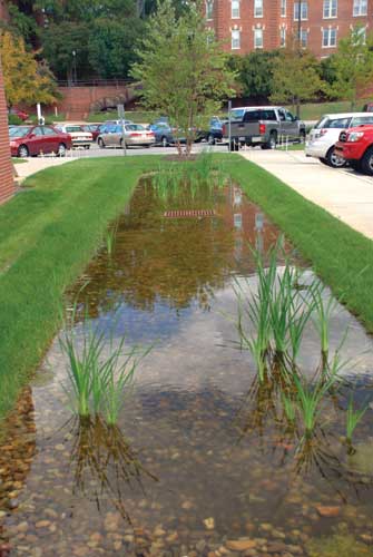 Stormwater was critical for this project, as 90 percent of the surface area is impervious. Stormwater controls include two interconnected rain gardens of riverstone and wetlands vegetation in the rear of the building for nitrogen reduction. This project received the 2009 Honor Award from the AIA South Atlanta region.
