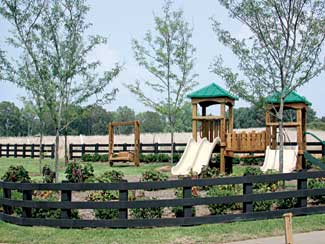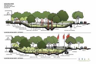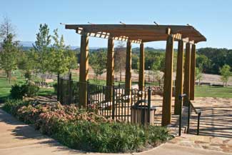 The signature park offers an arbor-covered pavilion for residential gatherings. Other common spaces include service alleys, access ways, passive paths and youth play areas. A proposed greenbelt trail will feature trailheads at detention ponds with masses of native planting. One of The Village?EUR??,,????'?????<???????????????????????(R)?EUR??,,????'????s parks allows the user an up-close experience of an unexpected phenomenon?EUR??,,????'?????<????????????????????an open throat sinkhole. ?EUR??,,????'?????<?????????????????Visual cues that interpret the site?EUR??,,????'?????<???????????????????????(R)?EUR??,,????'????s historic agricultural context were achieved using vertical elements like way-finding kiosks in the form of barn silos and oversized, animated farm tool sculptures,?EUR??,,????'?????<????????????????? notes CFJA.