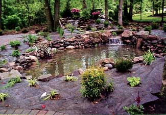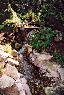 The second phase enlarged the first phase with walkways, gazebo, patio (circular) and more plantings. This installation was later enhanced by a much larger additional pond with a large falls, a stream and a smaller falls. A footbridge allows a great view of the falls and pond areas.