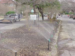 On January 15, 2000, four already competitive irrigation companies were challenged to see who could finish the median installation in the best, fastest and neatest manner. Even though they undertook the largest of the four medians, Utz Environmental Services emerged as the winner. Wilson Irrigation, Key Sprinklers, and Austin Eagle Management also participated in the challenge. The teams installed irrigation equipment donated by Rain Bird and Z-Water Works. Monetary donations were made by local residents and businesses to help with other associated costs. Contributors include: Greater Texas Landscape, J. Pinnelli Company and Robert W. Kearl, General Contractor.