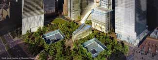 An eight-acre landscaped Memorial Plaza filled with nearly 400 trees will create a contemplative space separate from the sights and sounds of the surrounding city.
