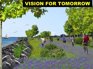 The Outer Harbor Greenbelt aspect of the project is a $14 million environmental restoration of 6,600 feet of Lake Erie shoreline that began in September 2006 and will be completed in the spring of 2008. This is basically a brownfield project to transform a former industrial area. It will include a scenic recreational 13-ft. wide paved path, green space, waterfront access for the community, a new shoreline stone revetment, site landscaping with native plants to attract wildlife, and even construction of a shallow-water fish habitat along the shoreline.