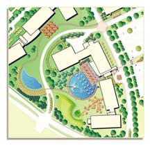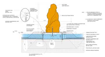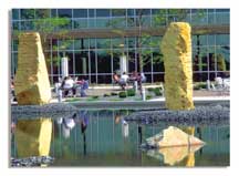 An important part of any corporate campus is the amenities that make the environment a better place to work. At Target Corp.?EUR??,,????'???s Northern Office Campus in Brooklyn Park, Minn., a circular water feature dominates the campus. Designed by Minneapolis-based Hammel Green & Abrahamson, this project won a 2002 Merit Award from the Minnesota Chapter of the American Society of Landscape Architects. Circular in form and punctuated with a grid of 14 Mankato-Kasota limestone megaliths, the reflecting pond serves as the social hub of the campus. The nearby dining plaza, shaded by honeylocust trees, overlooks the pond and accommodates a variety of activities from early morning tai chi to large corporate gatherings. Envisioned to include 1.3 million square feet of office space, this three-phase corporate campus houses Target Corp.?EUR??,,????'???s customer service, data analysis, inventory control and printing services. The company?EUR??,,????'???s goal for this campus is to ?EUR??,,????'??improve the quality of the work environment by giving employees a beautiful campus they can enjoy and appreciate in a variety of ways.?EUR??,,????'?? In 1961, Dayton's department store identified a demand for a store that sold less expensive goods in a quick, convenient format. Target was born. In 1962, the first Target store opened in Roseville, Minnesota. They were the first retail store to offer well-known national brands at discounted prices. Using stone as accent and pond floor material, the pond is a study in form and texture throughout the year. One of the few ?EUR??,,????'??winter ponds?EUR??,,????'?? ever built, the pond floor is sculpted in crushed Dresser trap rock as a dry stone garden that fully reveals itself only when the pond is drained. During the winter months the carefully contoured terraces of the trap rock on the pond floor become an interesting expression of topography that captures sunlight and shadow in many different ways. For contrast, a line of large Cold Spring granite stepping-stones forms a pier that enters the pond to engage the topography. This pier leads the eye over the water surface through the layers of stone megaliths to the other side of the pond. At the South Garden, a drift of crabapple trees flows across a linear pathway of crushed Cold Spring Granite, which evolves into a series of granite stepping-stones and granite benches, leading to an intimate gathering space. A sinuous pattern on the ground, which includes illuminated limestone boulders and ornamental grasses, serves as an artful foil that traces across the linear granite elements. A drift of pines anchors the North Garden and serves as a striking counterpoint to the deciduous trees of the South Garden. A large sculpted berm of native grasses provides edge to the space and engages the South Garden. A single 30-ton limestone boulder and a lone bur oak tree give the campus a sense of peace and privacy. Climate Challenges Because of the extreme conditions during the winter months, the trap rock bed is a unique solution to maintaining pools in a northern climate. The design was inspired by the tradition of dry sand gardens with large boulders rising up from the pebbles commonly used in Japanese gardens. While this makes the pond an attractive feature it was not an easy thing to do. The existing soils on the site were sandy and were unable to hold any water. This required a durable pond liner that would have minimal repairs and would not disturb the megaliths. To limit frost action and provide a durable means to retain water, HGA?EUR??,,????'???s civil engineers specified a three-layer geosynthetic liner system for the pond floor. Once graded and compacted, a geosynthetic clay liner was installed above the subgrade to act as a cushion between the flexible membrane liner and subgrade. A Bentomat ST liner by Colloid Environmental Technologies Co. was chosen. This liner contains a thin bentonite component between fabric layers. The bentonite then swells to plug leaks when hydrated with water. ?EUR??,,????'??Like so many northern climates, Minnesota is blessed with challenging temperature changes during the year,?EUR??,,????'?? said Gary Fishbeck, landscape architect with HGA. ?EUR??,,????'??It has the distinction perhaps of having the greatest temperature fluctuation of any other state, with ambient temperatures ranging from 100 degrees or more during the summer to minus 35 degrees or lower in the winter. ?EUR??,,????'??When considering pond design in a northern climate, landscape architect know that the pond will be empty several months of the year. Subsequently, from the very beginning HGA?EUR??,,????'???s landscape architects on the Target Northern Campus stressed the importance of a pond that would be as attractive when drained, as it would be when filled with water. This objective presented the team with significant challenges. Mechanical equipment, electrical equipment, and of course the waterproofing itself, are typically visible when ponds lie empty during the winter months. These elements had to be hidden.?EUR??,,????'?? Flexible membrane liners (FMLs) have a tendancy to shrink for the lower temperatures common in Minnesota, which can lead to possible failures in the liner. The FML was white on top to reduce thermal expansion and wrinkles associated with the elevated temperatures from sun exposure during construction. The landscape architects from HGA called for Dresser tap rock to overlie much of the liner. A minimum 304.8mm thickness is typically needed to protect liners from construction equipment. To achieve the pond?EUR??,,????'???s winter topography contours, the landscape architects envisioned as little as a 152.4mm thickness over much of the pond. The rock?EUR??,,????'???s inherent angularity further increased the risk of punctures. ?EUR??,,????'??A flexible membrane liner was chosen in lieu of a clay liner because clay liners are susceptible to frost action, which may affect the need to maintain p