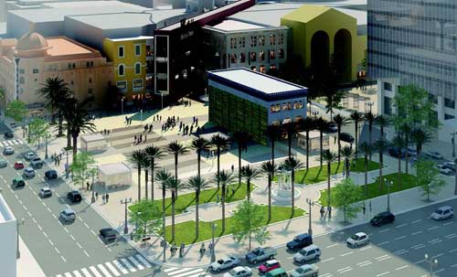 The Robinsons-May building to be demolished is about 10 feet below the Horton Park grade, a topography that affords the opportunity to create a multi-level space that might include stepped seating for an outdoor performance area.