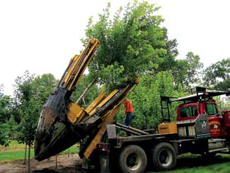 In the spading method of tree transplanting, 90 percent of the manual labor portion has been eliminated. The blades of this machine in mere minutes perform the work that would take men hours of hand digging. As far as the root systems go, spading is the least invasive method of transplanting. The spade will encapsulate 95 percent of the rootball of the tree; only a few lateral roots are cut below grade and cut cleanly by the blade creating less stress on the tree. The trees are then transported to their new location and planted back into the ground?EUR??,,????'??+in the ground is the natural environment for the rootball?EUR??,,????'??+not trapped inside wooden panels. Spading is very fast, efficient and most importantly, easier on the trees.