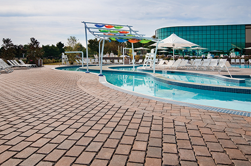 Versani felt the proposed design would meet the municipality's surfacing requirements, would contribute in keeping contaminants away from the pools, and would be aesthetically beneficial for this environment. Surfacing requirements vary widely from municipality to municipality, and Newtown officials were initially opposed to the use of permeable interlocking concrete pavers. By working with the municipality, explaining the benefits, showing the product, and making a valid argument to their benefit, OLC was eventually able to successfully secure the town's approval for the use of PICP. Utilizing PICP benefitted the NAC as well as OLC's plans. OLC was able to shrink the size and depth of the detention pond, thereby expanding the usability of the land. They designed the pavers and segmental retaining walls along the site's topography to put the PICP to work capturing any water that falls on the pool decks. Water collected on the pool deck is filtered to the detention pond below through a series of pipes in the subbase. A solid surface, such as traditional poured concrete, would have required the surface to be pitched away from the pools for drainage, which would have in turn led to more challenges with the site's elevation changes. The NAC site currently encompasses a total of 37,000 square feet of concrete pavers. After careful consideration, OLC chose to keep areas closer to the concession areas as standard interlocking concrete pavers instead of permeable. This is due to the fact that grease and oil spills are much more likely to occur near concession areas, and power washing is easier on solid surfaces than it is on permeable surfaces. PICP also enhances the area's aesthetics, and provides the ability to seamlessly add and remove pavers from certain areas while maintaining those aesthetics. For example, not long after the initial installation, there became a need to add permanent umbrellas. This addition required some pavers to be removed, a concrete sleeve to be poured, and the pavers reinstalled around the umbrellas. Other, more traditional surfacing materials would have caused the area around the newly installed umbrellas to appear unsightly; the pavers have eliminated that concern as the expansion continues. Some elevation challenges had to be addressed to incorporate the variety of outdoor amenities this project holds. In order to maximize the available space, 12,000 square feet of retaining wall was installed to separate the upper and lower pools, and the detention pond below. OLC chose the same hickory color for both the pavers and wall blocks to keep a uniform look throughout the project. The NAC has undergone two successful expansions, including the PICP installation at the aquatic center. A third expansion is slated to begin later in 2015. Versani and OLC, as well as the NAC, have expressed their satisfaction with the pavers' performance and the benefits they have provided for the site.