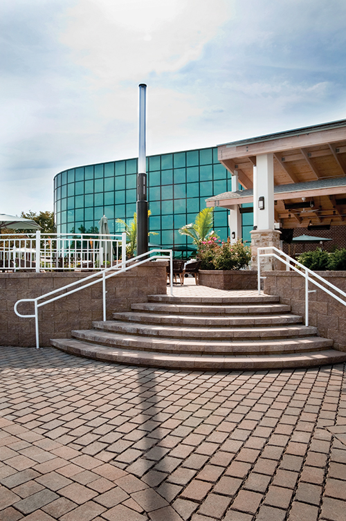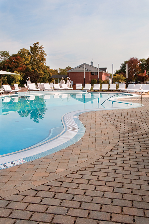 In late 2012, the extremely popular fitness center Newtown Athletic Club (NAC) in Newtown, Pa., an affluent suburb of Philadelphia in the Delaware Valley, underwent an impressive expansion to its outdoor amenities. Already well known for its fitness center and indoor sports complex, they embarked on an expansion that would make their club more appealing to a wider audience: an outdoor aquatics facility. For a project of this scope and size, the owners selected architects Ohlson Lavoie Collaborative of Denver. OLC has extensive experience with projects related to the health and fitness industries. Doni Versani of OLC brought 30 years of health, fitness, and aquatic design experience to the project. Plans included a comprehensive outdoor aquatics area with lazy river, zero entry pool, 25' slides, and dedicated kids' and adults' pools and hot tubs. A project of this size and scope provided some unique challenges. OLC had to consider the site, municipal requirements, and integration of the desired aquatic amenities within set parameters. Versani and the OLC team faced challenges relative to the amount of usable land, impervious surface requirements, and proper placement of the aquatic structures within the site's considerable elevation changes. After determining that the on-site soils were sufficient, OLC proposed permeable pavers for the pool decks because they allow for the most efficient use of the space and the best use of the team's design capabilities. After reviewing the hardscape options, they settled on a combination of the Munich green permeable paver and the Munich paver with a Mill-Tec® surface for solid surface areas. The pavers were used for the outdoor pool, patio and concession areas at the new NAC aquatic facilities. Versa-Lok® Square Foot™ units were used for the segmental retaining walls that separate the upper and lower pools and the detention pond.