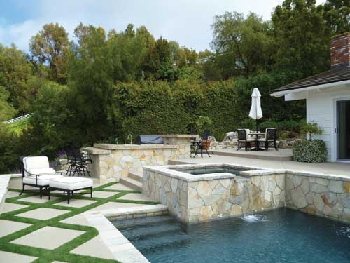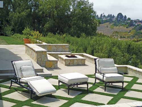 The Patio The contractor replaced all the old concrete with Sandstone-colored concrete with a washed-sand finish and patterned it with saw-cut diagonals on a 4-foot spacing. Hardscape workers installed 4-inch wide bands of artificial turf in a diagonal pattern between concrete pavers on the lower pool deck, creating a nice visual from the upper area.