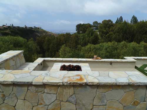 The Fire Pit Workers excavated and leveled the fire-pit area as well, as it was previously a sloped hill. They trucked in additional soil, to bring the area to a level grade. The crew built the walls and benches using cinder blocks, and then covered them in Lompoc stone.
