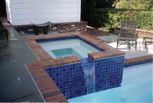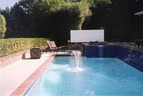 The Pool Area The 29x14-foot pool retained its size and dimensions, but the contractor ripped out all the existing hardscape and replaced it. They built two 4-foot benches with step-outs and added new entry steps. Plumbers added new lines for additional water cascades and jets, and ran them to a dedicated pump.