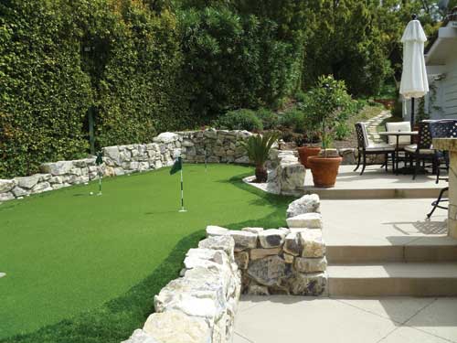 The Putting Green As the owners are avid golfers, they asked for a putting green behind the outdoor kitchen area. When the contractor arrived, the putting green area was a wild forest of trees and shrubs. So, the first order of business was to remove the plant material. Workers attacked the area with chainsaws, taking the area to the ground. They built the perimeter rubble retaining wall using dry-stack Palos Verdes rock.