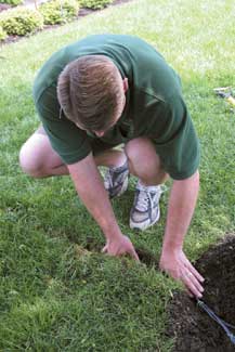 Wiring: NEC recommendations state wiring should be buried six inches down, and this often (though not always) serves as a basis for local code. However, when attempting to run line to fixtures in the near vicinity of roots, their toughness can make achieving this very difficult. Also, mulching tends to make the roots climb, which effectively means line initially buried at six inches will be drawn even deeper. This makes maintenance access extremely difficult. Middleton advises simply doing the best you can.