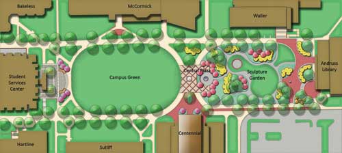 The space in front of Centennial Hall has transformed from a parking lot into a Central Plaza area within the campus quad, a transition area between the Campus Green and the Sculpture Garden.