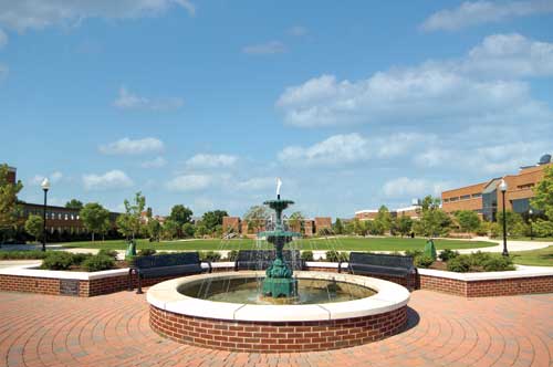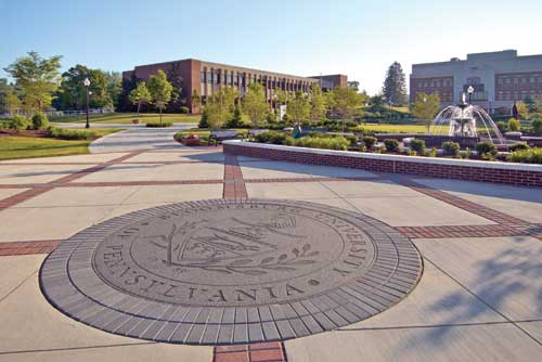 Bloomsburg University is a public university in Bloomsburg (pop. 67,295), that?EUR??,,????'?????<???EUR?s in east central Pennsylvania, a little north of the Susquehanna River. The before image (inset, left) shows the uninspiring parking lot at the entry to Andruss Library. The new design shows Andruss Library from the Central Plaza. The pavers (?EUR??,,????'?????<?Appian?EUR??,,????'?????<???EUR? from Hanover) are complemented with cast stone coping for the raised planters, seat walls and fountain pool. The seat walls and cast stone caps (Donald E. Kocher, Inc., supplied by Keystone Precast) are also replicated at the Andruss Library courtyard and at the stage area of the Student Center.