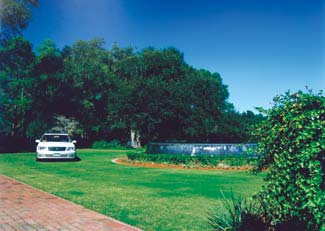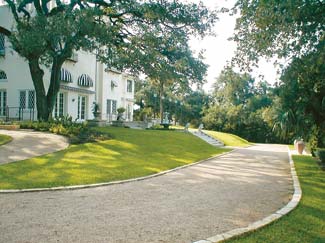 For grass pavers, the next step is to fill the rings level to the top with clean sand. Sand provides the best balance for strength, drainage, and air infiltration. Then lay thin cut sod or hydroseed directly on the sand. ?EUR??,,????'??I use Dwarf Fescue,?EUR??,,????'?? says Fogg, ?EUR??,,????'??It?EUR??,,????'???s drought tolerant, hearty, and can withstand traffic. In cooler climates you might consider a Bermuda.?EUR??,,????'?? Invisible Structures recommends that each driveway site be examined individually for the proper grass type. Rainfall amounts, sun exposure, and aesthetics are all variables to be considered when choosing grass. If sod is applied, use a sod roller to ensure good contact is made between the roots and the sand/top of the rings. If hydroseeding is applied, extra watering may be necessary during the first growing season. In both cases, wait three mowing cycles to drive or park on the installation.