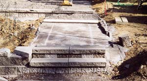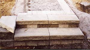 Because the Pisa lights are backfilled, the hole where the wire enters the block must be water tight. In this case, the looped wire required two wire penetrations, one for an in and an out wire. The homeowner drilled a hole into the garage to allow the wires access to the transformer. Although it is not necessary with low voltage wiring, he ran conduit from the hole in the garage wall down below ground level for aesthetic reasons. Finally, before backfilling the Pisa lights we tested them by hooking up the transformer. With everything working properly, we backfilled and compacted the soil to prepare for the walk.